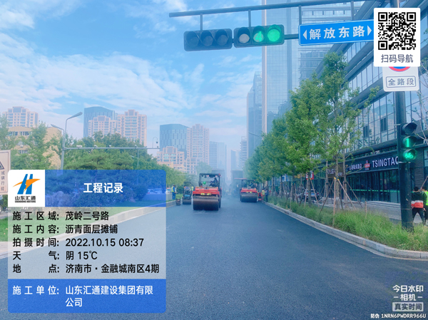 10月15日,濟南市中央商務區瀝青面層一期——茂嶺二號路快車道瀝青開始施工。茂嶺二號路全長1446米,分為東西兩半幅,半幅寬度9.25米,此次攤鋪作業面積約3.4萬平方,計劃SMA-13瀝青馬蹄脂碎混合料用量3264噸,現場機械使用4臺攤鋪機,4臺大壓路機,3臺小壓路機聯合作業。