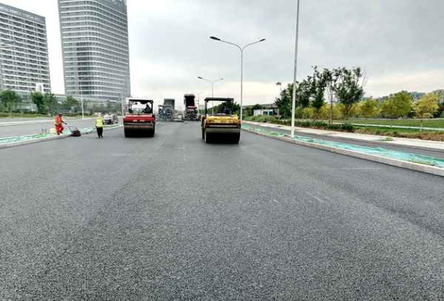 此次攤鋪作業道路總長1.45公里,道路寬度為50米,攤鋪面積約50800平方米,現場4臺攤鋪機、3臺壓路機同時施工。為確保攤鋪順利進行,攤鋪前,項目部組織施工技術、質檢、安全、勞務隊伍等相關人員召開技術安全交底會;攤鋪作業中,施工人員對攤鋪溫控和厚度、瀝青攤鋪速度、碾壓遍數等步驟進行嚴格把控,確保攤鋪質量。